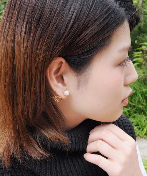 メタルラインで模った、多角形のキャッチが個性的なバックキャッチのピアス。角度によっていろんな表情を見せてくれます。前後を逆にしたり、ほかのピアスと組み合わせることもできるのでコーデの幅も広がります。