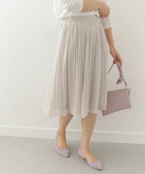 ふんわりとしたシフォン素材が女性らしい面持ちで合わすことの出来るプリーツスカートは、広がらない落ち感のあるシルエットなので甘すぎず上品な印象の一着。