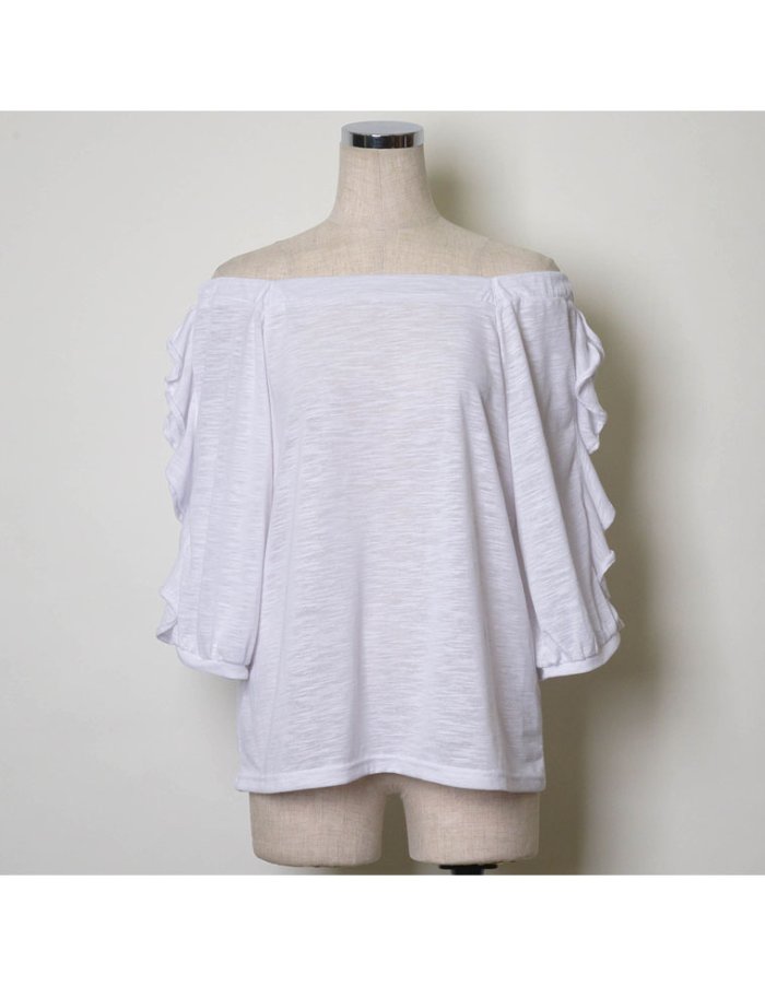 袖に施したフリルがフェミニンな印象を与えるトップス。