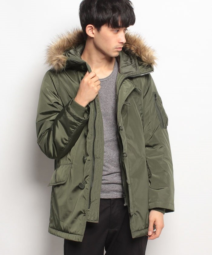 シャイニーな風合いが目を引く、中綿N-3Bミリタリージャケット。フード周りにフェイクファーをあしらった、存在感のあるデザイン。合わせやすさも魅力の一品。