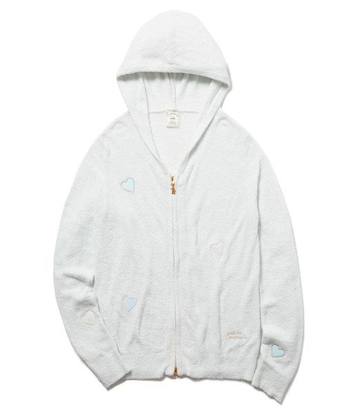 ハート柄のパッチワークがポイント。同色でまとめているから合わせやすいパーカ。フロントのきらめくロゴ刺繍も、目を引くアクセントに。フロントはダブルファスナー仕様なので、裾を開けてAライン風にアレンジしても可愛く決まります。