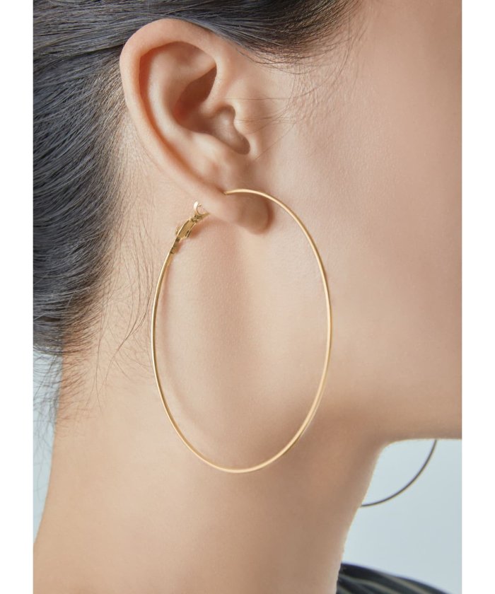 とても細いワイヤー状のメタルで作られた、大きな直径のフープピアス。大きいですが線が華奢なため品の良さを失わず、着け心地も軽いのが特徴です。
