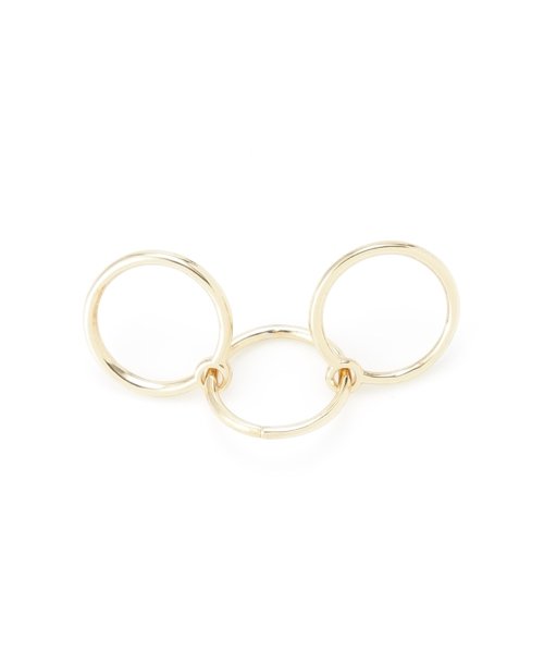 知恵の輪のようになった、ラウンドモチーフの2連リングは、重ねて1本のリングとして付けるもよし、バラバラに隣り合った2本の指にもつけれる、遊び心のあるデザインが魅力です。色は、シンプルなゴールド、それにパールをあしらったもの、クリアなビジューをつけたものと、同じシリーズで3つの異なるディテールが選べます。