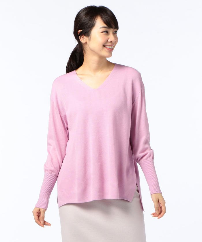 16Gミラノリブで、質感の良いVネックプルオーバーニット。今年らしいデザインディテールがいっぱいでお洒落度抜群。袖口のリブが長めなので、ゆとりのあるシルエットでもすっきりと着こなせます。さっと着るだけで旬のコーディネートが完成する便利な一枚です。