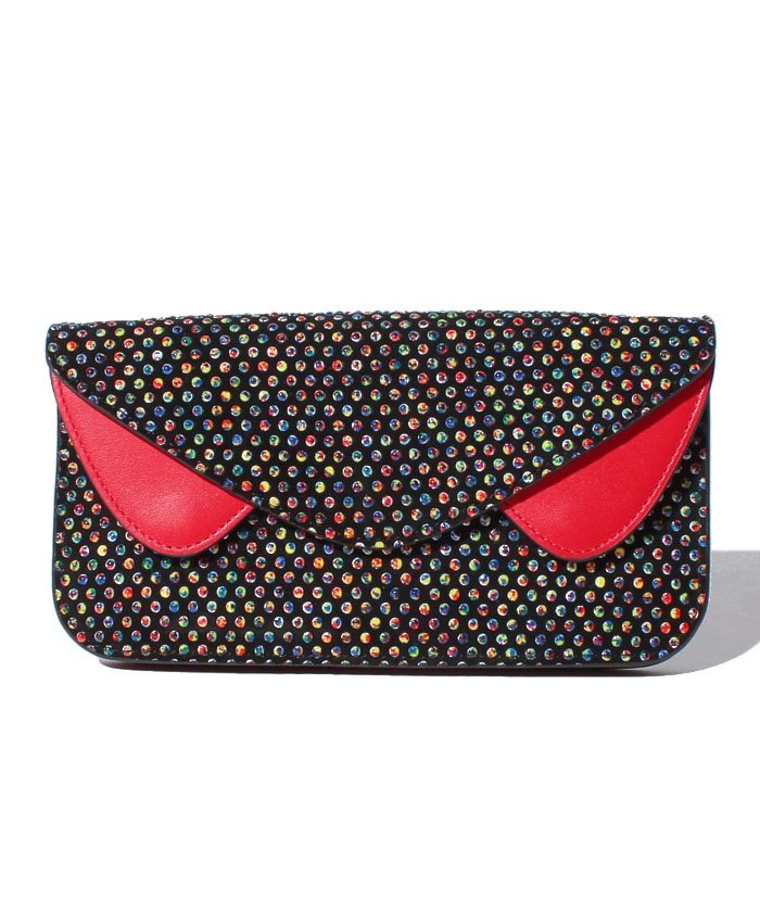 ツブツブした立体的な革が特徴的なシリーズです。ドットの1つ1つが虹色になっていて可愛いです。そのままお財布として使用できるショルダーバッグ、スナップを開けると札入れが2つ、ファスナーポケットが1つ、カードポケットが9枚分付いています。猫耳になった部分のスナップを開けるとポケットになっています。背面にもオープンポケットが付いています。付属のショルダー紐を使用せず、クラッチバッグのように使用することもできます。
