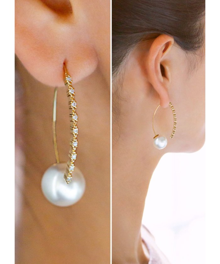 このピアスの構造はちょっと変わっており、パール部分がキャッチ(ピアス針の受け金具)になった個性派仕様。パール部分が取れるようになっており、それに針を差し入れて留めるようになっています。そのためどの角度から見てもオシャレで、とても洗練された印象に。全体的にはアーモンド型のフープピアスになっていて、そのフォルムも素敵です。