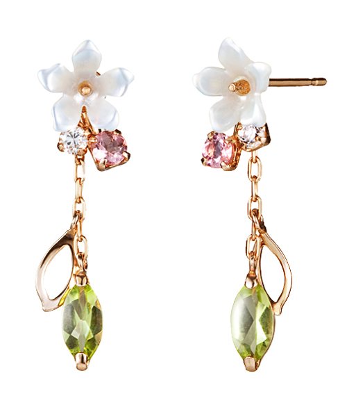 耳元の白いお花がかわいいピアス! 流れるように下がる葉っぱが、大人っぽさも演出します。