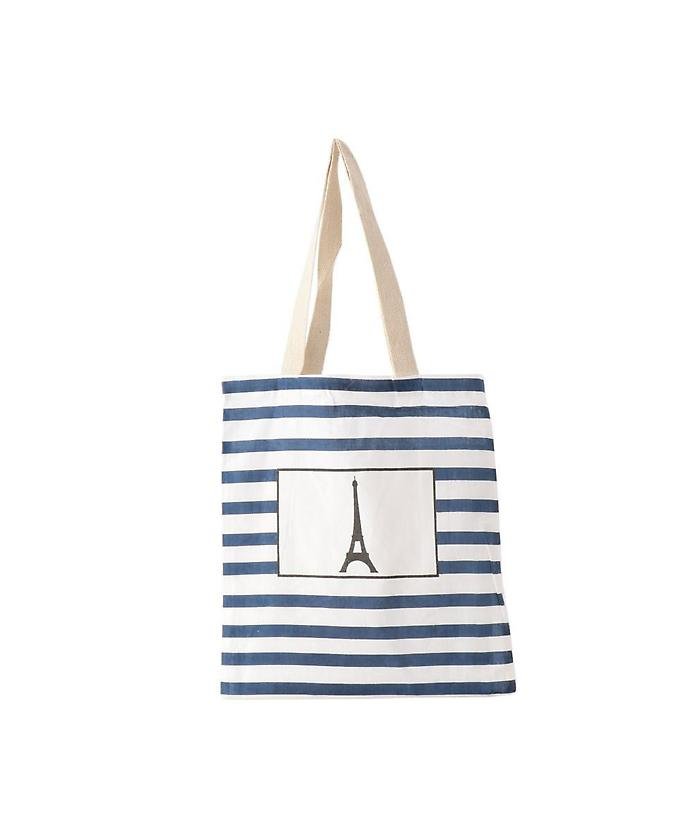夏のお出掛けに大活躍するキャンパストート。フレッシュなボーダーとエッフェル塔のコンビが新鮮で爽やか。可愛くて夏らしいキュートな逸品です。スリムなので肩掛けしやすく、サブバッグとしても活躍。小さくたためるので、旅行先やビーチにもお勧めです。