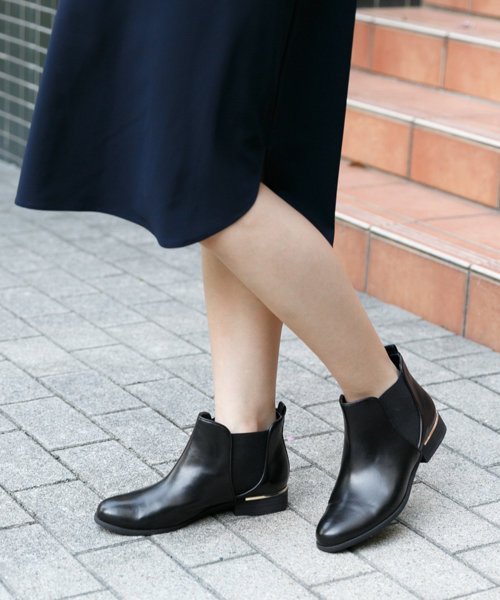 ローヒールで履きやすいサイドゴアタイプのフラットシューズ。シンプルなつくりでどんなスタイルにもハマるのが魅力のひとつ。また、かかとにさりげなくゴールドのアクセントがあり後姿もぬかりなく。秋口は素足で、冬に向けてソックスや厚手のタイツなど楽しみ方はたくさん!これからの季節の足元にマストアイテムです。