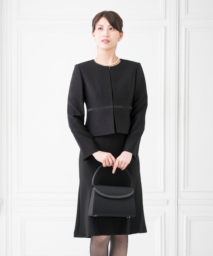 ワンピースはより上品さを引き立たせるマーメードラインで、ジャケットを羽織ったようなデザインは、喪服以外にも結婚式にも着用いただけるワンピースとなっており、機能性まで加えたアイテムとなっています。