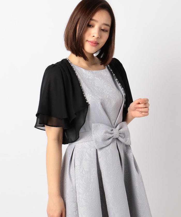 ドレスコーデの名わき役ボレロです。ほんのり透け感のあるシフォンでエレガンスに、ティアードのフレア袖で気になる二の腕もさりげなくカバーしてくれます。襟ぐりにはライン状にビジューをON、存在感もたっぷりです。