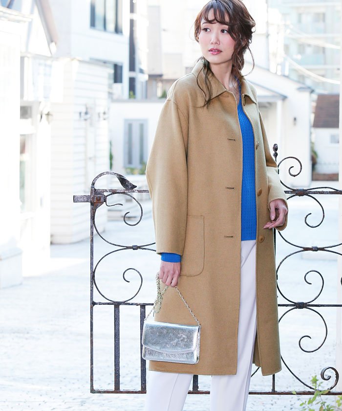 マニッシュな印象と高級な接結仕立てがポイントのステンカラーコート。動くたびに生まれる流れるようなドレープは、大人の雰囲気を醸し出してくれます。肩掛けで軽く羽織ったり、同素材のベルトでウエストマークをしてスタイリッシュに仕上げても素敵に決まります。オフィスシーンからオケージョナルまで対応する”きちんと顔”のコートは、クローゼットに持っておきたい一着です。
