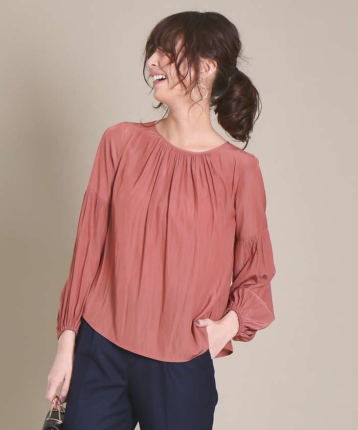 微光沢でとろみ感のあるギャザーブラウスが大人女子にぴったりの一枚。