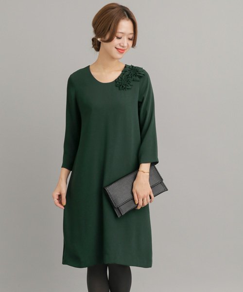 胸元を同生地のフラワーモチーフのコサージュであしらったドレスワンピースは、シンプルなデザインにさり気ない華やかさをプラスしたアイテム。