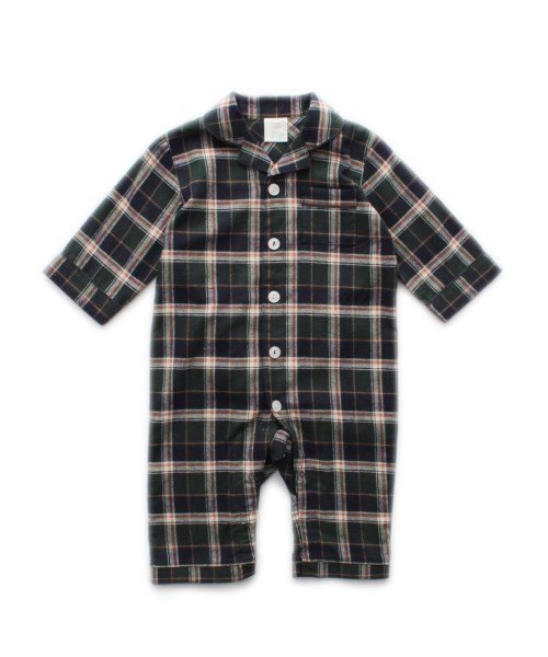 パパのシャツみたいなチェックパターンが新鮮。襟や胸ポケットなど、ディテールもマニッシュテイストなbabyロンパースに仕上げています。シーズンムードを楽しめるデザインです。