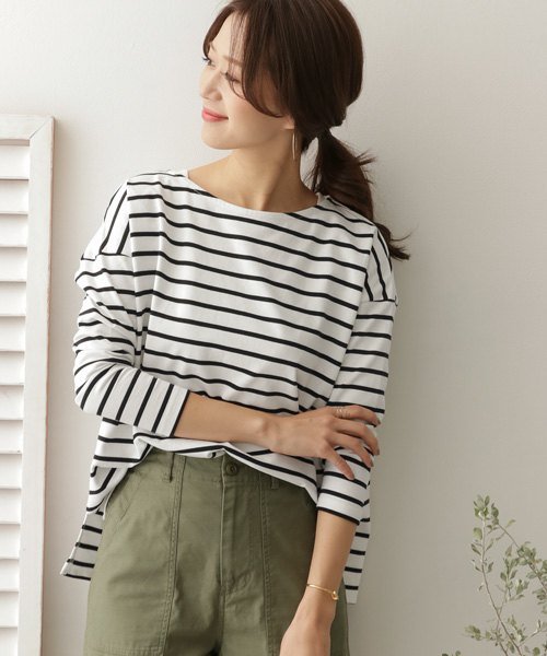 定番アイテム・ボーダーカットソーをワイドシルエットのプルオーバーでご用意しました。 上品さの出る生地感と、程よく肩の落ちたボリューム感の出るアイテムなのでカジュアルダウンしすぎず、細身のスラックスやタイトスカート合わせなどでキレイめなスタイリングにもマッチする一着です。 もちろん王道のデニム合わせも野暮ったくならないので、シンプルなコーディネートでも抜け感のあるワンランク上の印象に仕上がります。