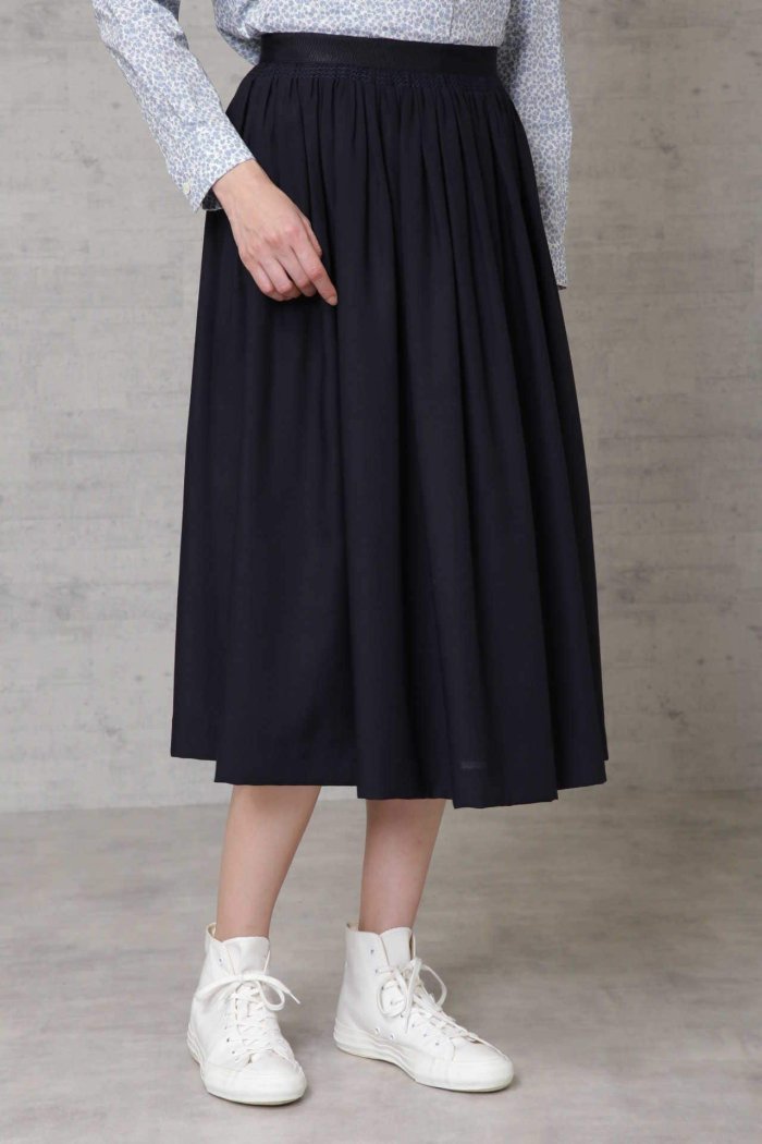 軽さのあるウールポリエステルのビエラ素材です。ウールよりもポリエステルの混率が多いのでウエストのタックをアイロンの熱で定着させることも出来、ドライなタッチが特徴の素材を使用しています。春先まで着用出来るロングシーズン着用可能なスカートです。ランダムタックをとりながら刺繍を同時にしていく希少な刺繍ミシンをウエストトにほどこしています。レースのプルオーバーとのコーディネートで上品なスタイルがお勧めです。