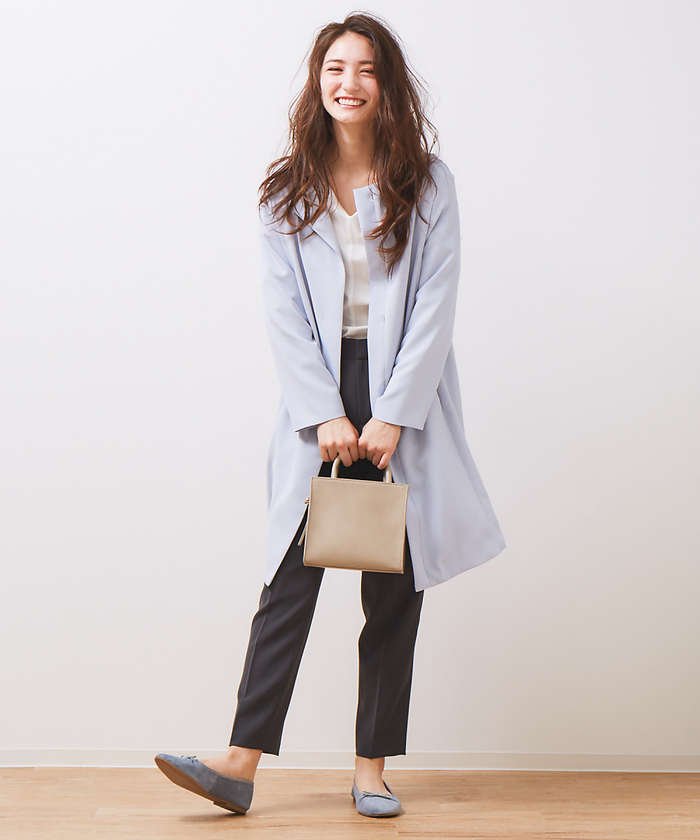 ノーカラーのコートはホックをフロント部分を止めるデザインになっているので、ボタン開きのものよりも綺麗見えして上品な印象が叶います。同素材のセットアップの上に羽織るときちんとした印象に。デイリーコーデにさらっと着て、通勤スタイルとしてもおすすめ。
