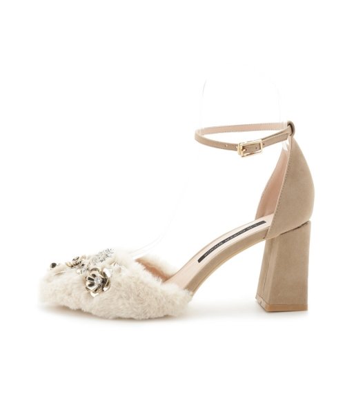 ふんわり柔らかな風合いのエコファーに、フラワーモチーフのビジューをのせて、足元から華やぎを演出。ヒールも起毛させた生地で包んで、あたたかみのある印象にまとめたパンプス。甲はすっきりとのぞかせて、女性らしい肌見せも叶えます。