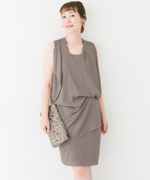 アシンメトリーのドレープがポイントのドレス。ややタイトめなシルエットで、スタイルアップ効果抜群。シンプルな中にも個性が光るデザインは、上品な大人の女性を演出してくれます。非常に軽い素材を使用しているので、着心地◎。ペチコート付きなのも嬉しいポイント。