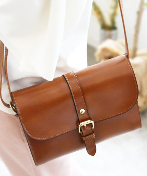 フロントのベルトデザインがアクセントになるショルダーバッグ。コロンとしたコンパクトなサイズはデイリーユースに最適♪本革に迫る滑らかな表面は高級感ある上品な仕上がりです。内側には小物収納に役立つファスナー付きのポケット付き◎普段使いにも、フォーマルなシーンでも。デザイン・機能性両方を兼ねそろえた優秀アイテムです。