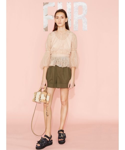チュールとレースをドッキングした軽やかなブラウス。袖のボリュームがポイントです。ウエストはシャーリングできゅっとシェイプして、女性らしいメリハリあるシルエットに。ぺプラムフリルなのでアウトの着こなしがお勧めです。