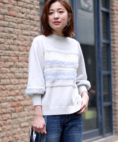 質感の違う素材をミックスしてボーダーをデザインしたワザありニットトップスです。さり気なくラメ素材がミックスされているから大人カジュアルにぴったり。ふっくらとしたスリーブが着こなしの旬度をアップしてくれそう。