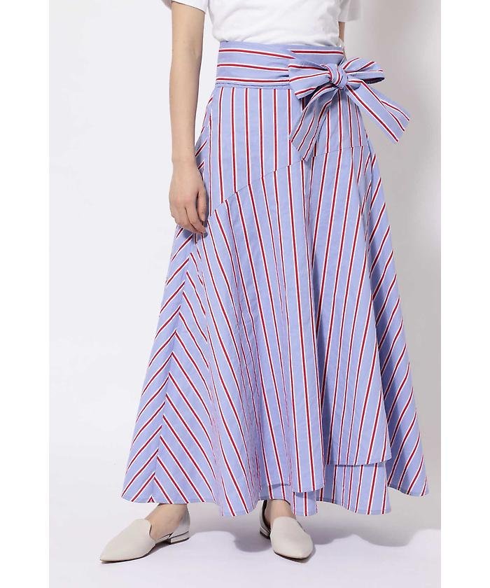 女性らしいニュアンスを引き立てるラップ巻きに、マルチストライプの掛け合わせが印象的なスカート。共地ベルトでウエストマークし、背面はファスナー&ゴム仕様ですっきりした後ろ姿を演出。長めの着丈や裾に向かったフレア感が大人びた印象です。カットソーやニットを季節に合わせてスタイルを組める一枚です。