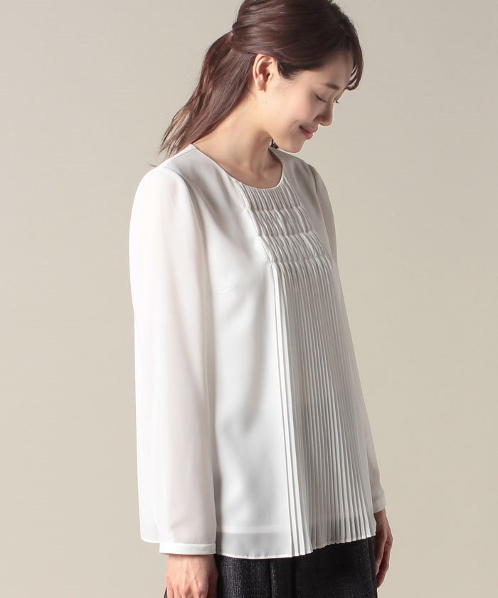 フロントに施した細やかなタックプリーツが、気品を高めるアクセントになったプルオーバーブラウス。すっきりとしたノーカラーデザインで、顔周りはスマートに。ジャケットやスーツのインにもおススメの1品。