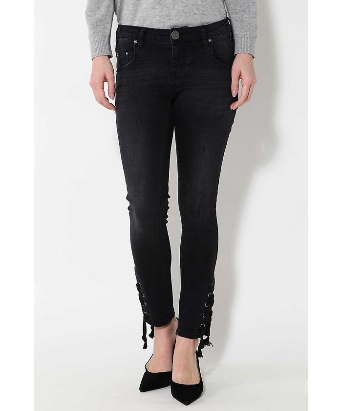 裾のレースダウンで今季らしいスパイスを投入した個性的なスキニーパンツ。少しウォッシュの効いたブラックスキニーで格好よく、適度なダメージ加工を施し、ONE TEA SPOONのロゴ釦など、細部まで凝った仕上がりです。シンプルTシャツやキャミソール、イージーニットなど、季節に合わせてカジュアルコーデを堪能できます。