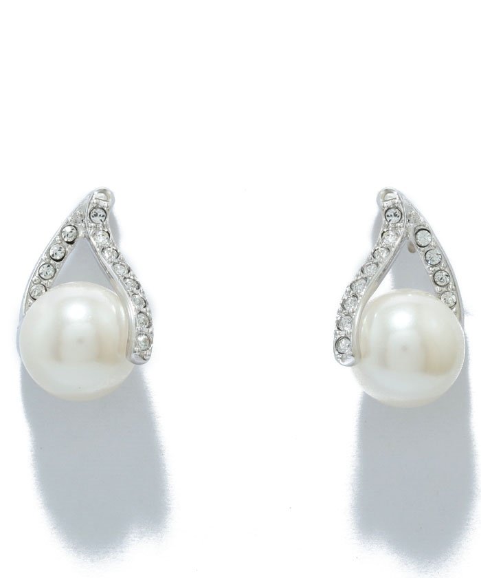 カットガラスのラインが大粒のプラスチックパールを立体的に包み込む、シンプルで洗練されたドロップモチーフのピアスです。シルバーカラーのメタルの輝きが、上品な華やかさを演出します。