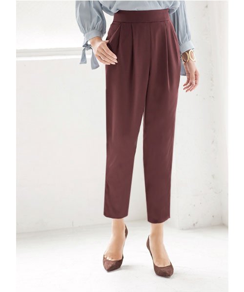 大人気の洗えるマットサテンパンツから秋色が登場です!日本製ならではの縫製と生地質感が美しい、程よく華やかなタックデザインパンツ。ツヤを抑えめにしたマットサテン地の“ほんのり光沢感”が上品で、シンプルなのにオシャレ!な雰囲気が漂う1本です。このパンツはとにかく生地からにじみ出るオシャレ感が強いので、トップスはごくシンプルにしてもスタイリッシュにキマるところが秀逸。Tシャツやカットソーなどのカジュアルなアイテムを合わせても、クラス感のある着こなしが完成します。 この生地は季節を限定せずに着用することができ、秋冬にはニットなどを合わせて快適に穿いていただけます。サテン生地は基本的に暖かいので、冬でもたくさん活躍してくれるのも特徴。しかもこの生地がさらにすごいのは、こんなにオシャレ感のある生地なのに手洗いが可能なところ。キレイめコーデからカジュアルまでアレンジできる着回し力の高さと併せ、とてもコストパフォーマンスの高い1本です。 パンツのシルエットは太ももまわりにゆとりがあり、裾に向かって細くなるテーパードライン。気になる太ももを自然にカバーしつつ今っぽい、スタイリッシュな優秀パンツです。わかりやすくストレッチ性のある生地ではありませんが、動きに合わせてしなやかに沿う、わずかな伸縮性で穿きやすいのも特徴です。【お色の特徴】ワインよりややブラウンがかったアズキ色。深くややくすんだ高級感のあるお色です。ワインのように色が強くはないので、会社でも着ていただけます。