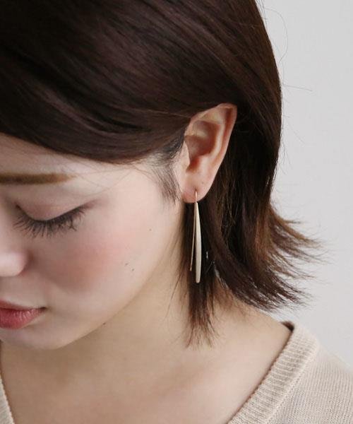 洗練されたフォルムが大人な印象の、細身プレートのロングフックピアス。耳から垂れさがる滑らかな縦長ラインがフェイスラインをすっきりと見せてくれます。フックの長いのでピアスホールから抜けにくく、うっかり落としてしまう心配もありません。艶消しのマットタイプが上品で、大人カジュアルスタイルにもぴったりのひと品。