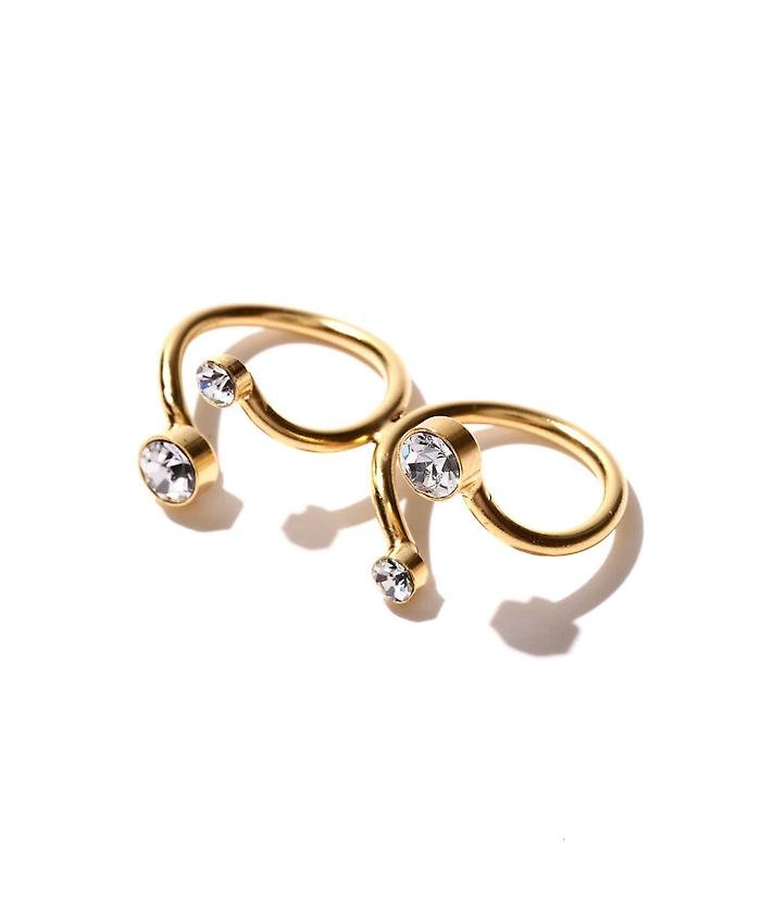 アメリカ発のジュエリーブランド YOCHI からリングの登場。指に絡まるようにカーブを効かせた変形フォークリング。重ね付などでオシャレを楽しむと◎ トップには大小のラインストーンをキラリと輝かせて手元をリッチに飾ります。※大11号・小8号