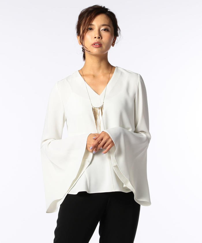 フレアなベルスリーブが美しいブラウスです。肘からフレアに広がった袖がエレガントで女性らしい雰囲気を演出し、フェミニンな仕上がり。サイドも立体的なデザインで少しフレアになっており、スタイリッシュ。大人の女性らしいデザインの一枚です。