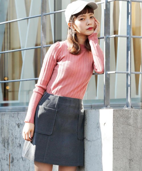 フロントの切り替えデザインと大きなパッチポケットでレトロエッセンスをプラスした台形スカート。ほんのりと起毛したシャギーのウォーム感がシーズンムードを高める1着。トップスインでスッキリと着こなすのが今年流です。