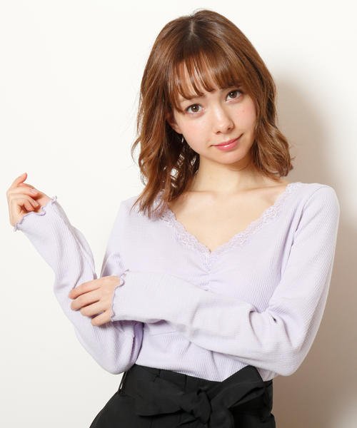 首まわりにあしらわれたレースがフェミニンなアクセントになった、縦柄ワッフルプルオーバーです。顔まわりをすっきりと見せる深めのVネックがポイントに。袖口と裾のディテールが愛らしい雰囲気をプラスします。