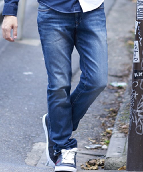 色落ち加工をほどこしヴィンテージ感を出した、スリムフィットのデニムパンツ。ストレッチが効いていて穿き心地にもこだわりました。ポケットラインに入れたトライカラーの刺繍ワンポイントがブランドらしさを物語ります。
